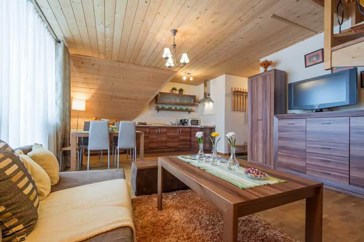 Apartmán POD-SMERKIEM - Bezpochyby je to ideálny horský apartmán v rustikálnom štýle, 6 km od Zakopaného - ideálny pre rodičov s deťmi. Drevené podlahy a steny, ostré šikmé hrany (účinok blahodarných a regeneračných vlastností pyramídy), schody spájajúce dve veľmi priestranné poschodia a nakoniec nádherný výhľad na Západné Tatry. Neďaleko sa nachádzajú zjazdovky s lyžiarskymi vlekmi a termálnymi bazénmi Chochołowskie Termy a kúpaliská na Szymoszkowe.
