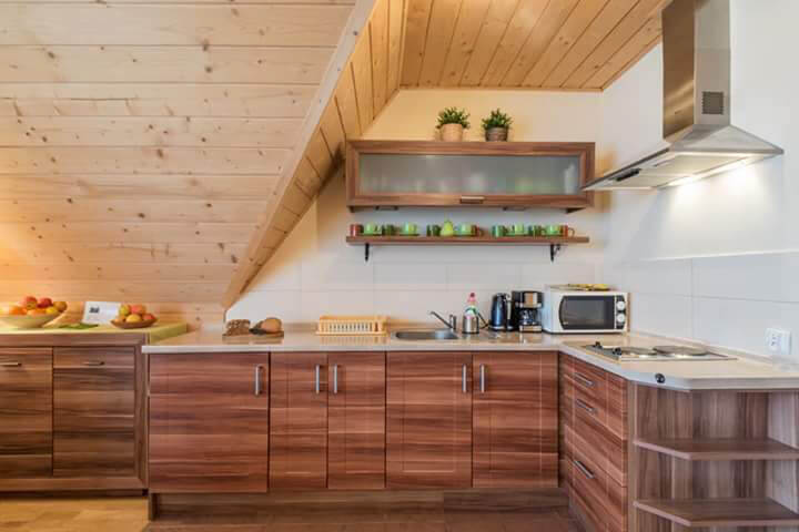 chladnička s mrazničkou, rýchlovarná kanvica bezdrôtová, mikrovlnná rúra, varná doska s dvoma horákmi, hriankovač s funkciou grilu, riad, hrnce, príbory, kávovar