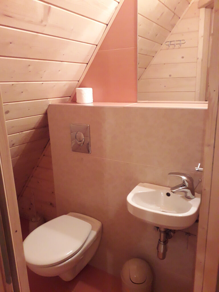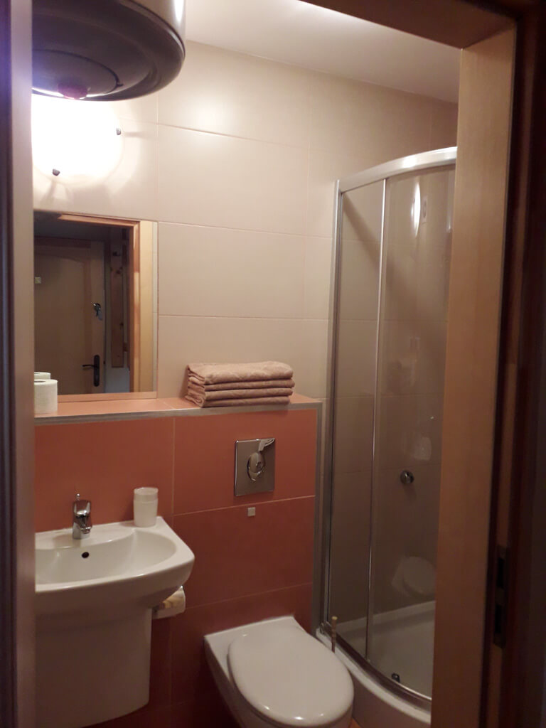 sprchovací kút, umývadlo, WC, sušič vlasov, uteráky, podlahové kúrenie